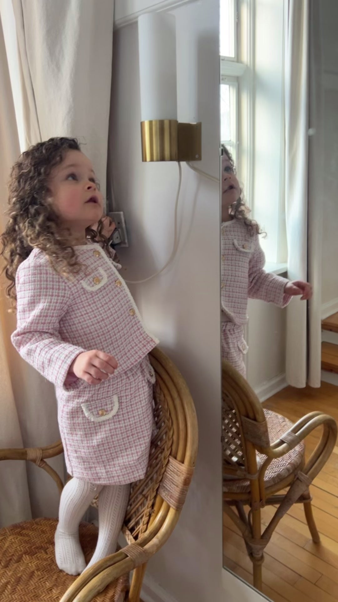 Elegant todelt børnesæt i sart rosa med klassisk, struktureret finish. Består af en jakke med fine knapper og lommedetaljer samt matchende nederdel. Perfekt til særlige anledninger - tidløst, feminint og komfortabelt.
